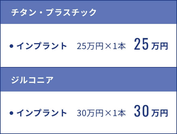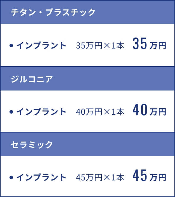※使用するインプラントのメーカーなどにより、費用は変動します。一例としてご参照ください。